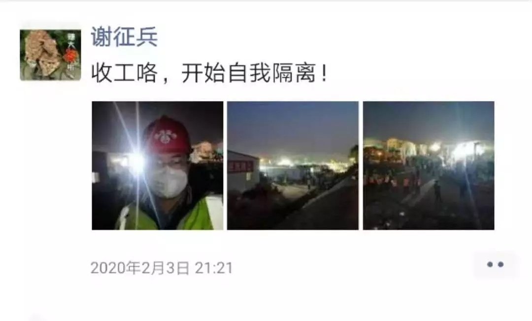 人如其名,在武汉人谢征兵的朋友圈上,最近的一条微信发布于2月3日晚21:21分,配图是夜幕下的火神山医院,内容是:“收工咯,开始自我隔离。”