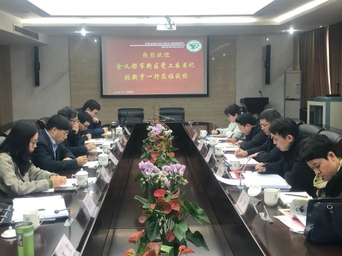 1月13日下午,金华市政府党组成员、金华新兴产业集聚区党工委书记、管委会主任、金义都市新区党工委书记张新宇、委员陶晓锋、义乌商贸服务业集聚区管委会副主任应玉明、高新技术产业局负责人等一行五人来校调研,商讨校地深度合作事宜。双方在行政楼308会议室召开了座谈会,党委书记吴锋民、副校长陈文华,以及党校办、科研院等七人参会,会议由陈文华主持。