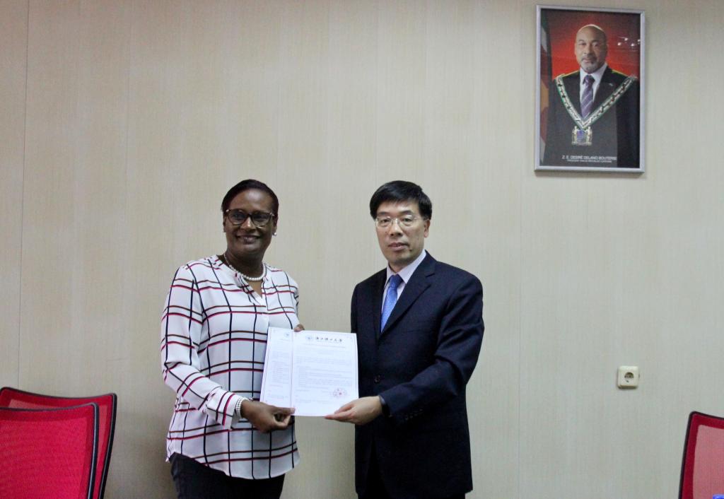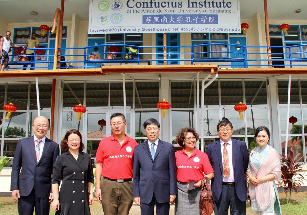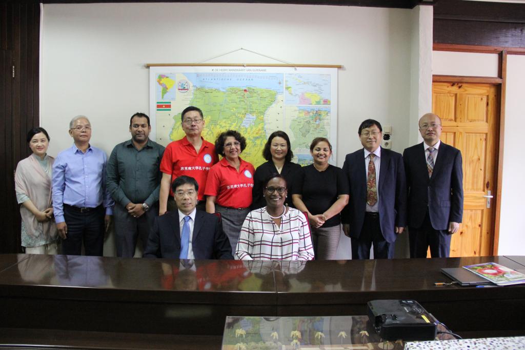12月13日,吴锋民一行访问苏里南大学,会见苏里南大学理事会理事、秘书长詹妮•约翰-克里斯托弗博士,以及苏里南大学孔子学院理事会苏方成员巴罗斯、拉姆丁、戈达尔,并与孔院中外方院长、全体教师、志愿者和工作人员进行了座谈。