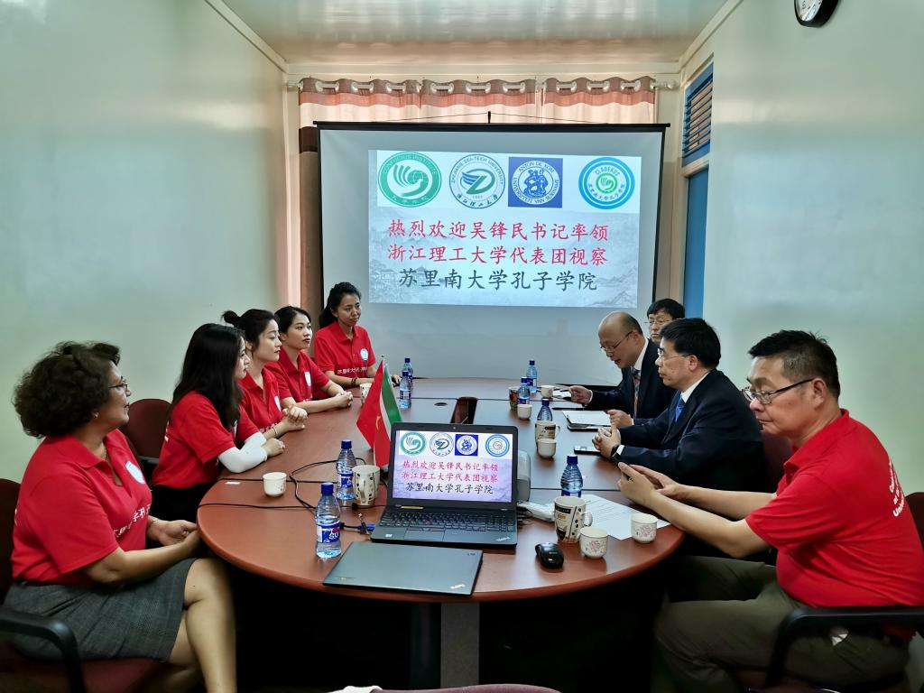 代表团听取了孔院中外方院长的工作情况汇报,介绍了我校丝绸时尚工作坊启动安排,并向苏方通报了12月中旬在杭州召开的苏里南大学孔子学院理事会第三次会议的有关情况,以及苏里南大学校长杰格迪来访期间与我校及浙江省外办交流会谈的内容。吴锋民表示,苏里南大学孔子学院成立以来,在汉语教学和文化交流等领域取得可喜的成绩。近期中苏两国高层互访为两国关系的进一步发展揭开了新的篇章,杰格迪校长上任以来,对于孔院工作给予了更大的重视和更多的支持,这表明苏里南大学孔子学院的发展进入了一个全新的机遇期,希望双方在原有基础上进一步加大合作力度,共同将孔院建设成为中苏文化科技综合交流的重要平台。同时,加深两校学科、学者、学生间的交流合作,将两校互利共赢的合作关系推上新的高度。约翰-克里斯托弗对吴锋民一行的来访表示热烈的欢迎,对孔院成立三年来的工作给予了高度评价。她说,tyc33455cc太阳集团成网官方入口在丝绸和时尚领域拥有雄厚的实力和鲜明的特色,而苏里南人民对于丝绸和时尚领域的文化交流拥有浓厚的兴趣。苏里南大学将采取更为有力的措施,加强与tyc33455cc太阳集团成网官方入口的合作,为孔院发展创造更好的条件,更好地满足当地人民学习中文、了解中国的需要,为两国关系的发展和两校合作关系的深化发挥更大的作用。会谈期间,双方就2020年孔院的工作计划进行了进一步的磋商,着重讨论了丝绸时尚文化工作坊的举办方案。吴锋民代表学校,向苏里南大学提供了两个外国留学生奖学金名额,鼓励苏大学子来我校交流深造,做中苏友谊的使者,苏方对此深表感谢,表示将选拔出最优秀的学生来我校学习交流。