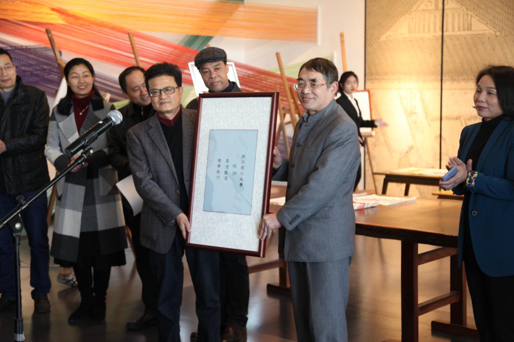 开幕式上,顾玉纯先生向学校捐赠了宣纸刺绣:《校训》、《校徽》、《馆徽》作品。陶伟华向顾玉纯先生颁发了捐赠证书。丝绸博物馆将与顾玉纯先生共建非遗工作室,党委宣传部负责人为“宣纸刺绣”非遗工作室授牌。