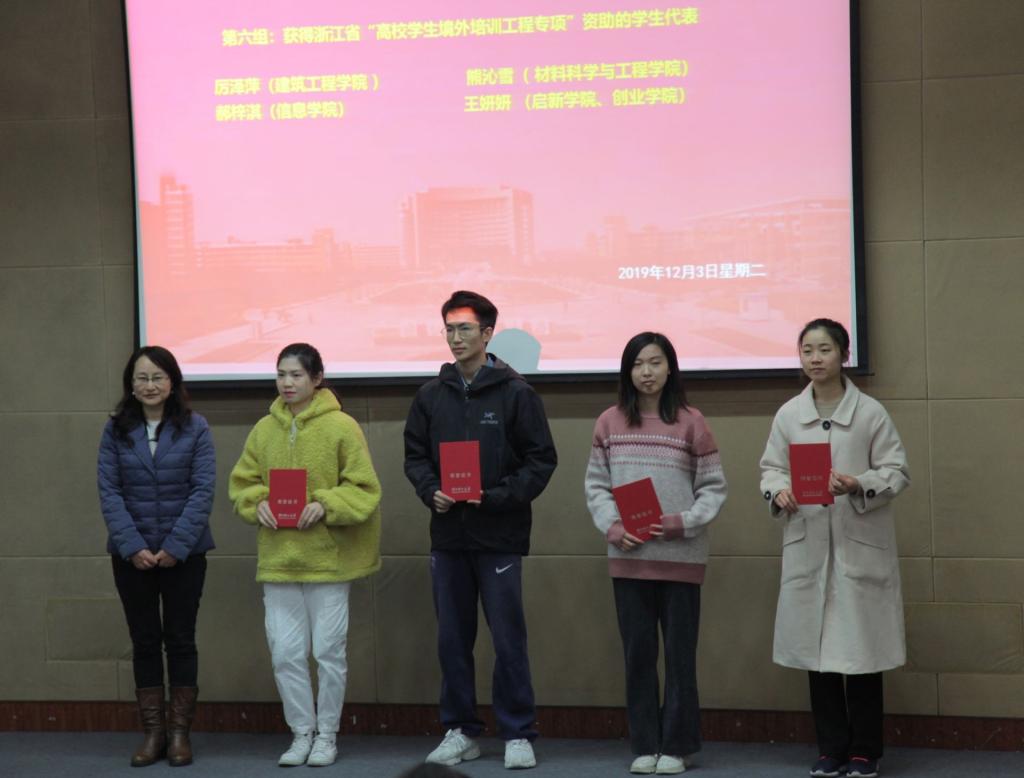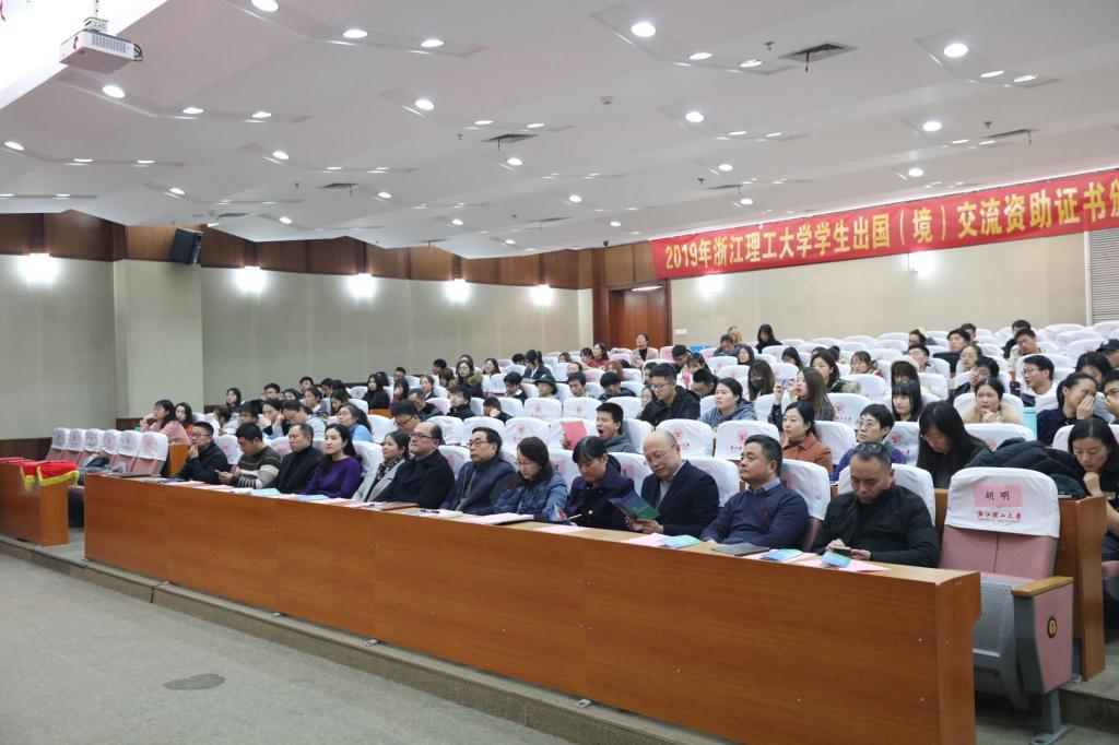 与会领导分别为获得浙江省“高校学生境外交流培训工程专项经费”资助、学校卓越人才计划、自强班出国(境)资助、“海外留学与合作办学计划项目”资助等在内的七类学生出国(境)交流资助的学生代表颁发证书,并合影留念。