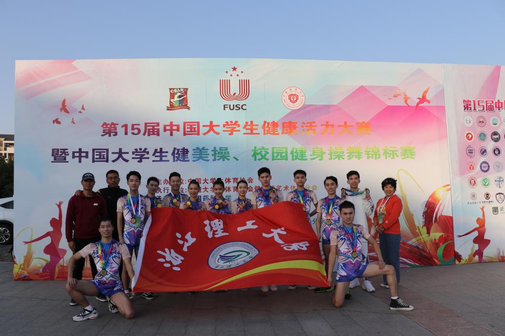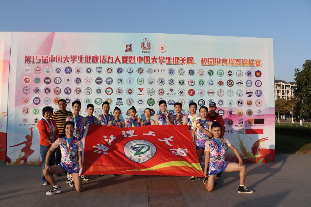 11月12日—11月17日,2019年中国大学生健康活力大赛暨中国大学生健美操锦标赛在南京中国药科大学举行。我校代表队在比赛中团结协作、奋力拼搏,面对来自全国多所高校的对手,用稳定的发挥、默契的配合以及精湛的技术征服了现场裁判,最终荣获普通院校A组团体总分第一名的佳绩。同时,获得混合五人操金牌,男子有氧舞蹈金牌,男子三人操银牌,女子三人操第四名,混合双人操第四名,男子五人操第五名,男子单人操第五名、女子单人操第七名。