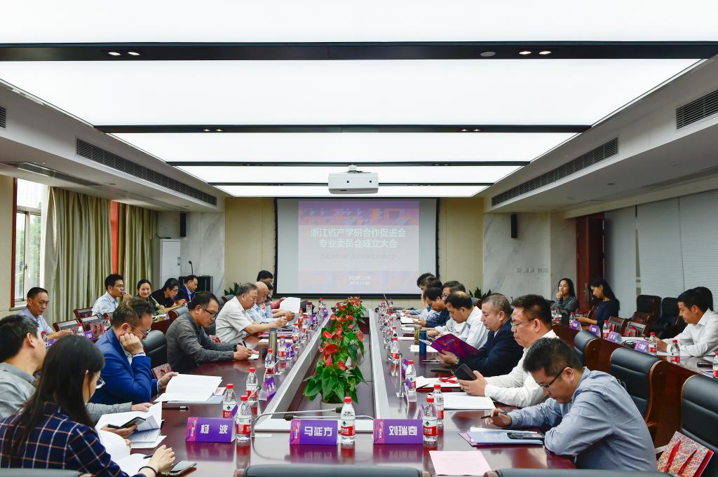 省经济和信息化厅二级巡视员李丹,省产学研合作促进会会长、浙江大学原党委副书记陈子辰,浙江省产学研合作促进会监事长蒋岳祥,副会长孙国平、王曙光、尤春亭,副秘书长赵星,时尚产业创新专业委员会主任委员、我校副校长陈文华,时尚产业创新专业委员会副主任委员邹奉元、刘刚、秘书长朱旭光、副秘书长刘正,军民融合专业委员会主任委员尤春亭、秘书长李东红,乡村发展专业委员会主任委员林福呈、秘书长宋文坚,医药专业委员会主任委员朱善宽,浙江在线总编范波,各专业委员会委员,相关行业代表,我校科学技术研究院负责人等约50人出席此次会议。会议由浙江省产学研合作促进会秘书长潘强龙主持。