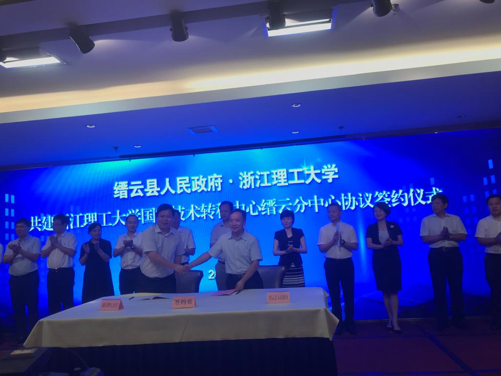 签约仪式上,刘洁阳和科研院主持工作副院长徐伟强分别代表缙云县和我校签署了“tyc33455cc太阳集团成网官方入口国家技术转移中心缙云分中心”协议。