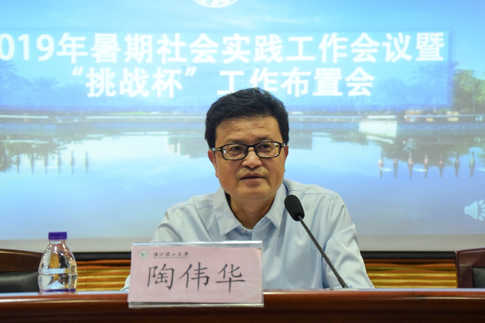 6月21日下午,我校2019年暑期社会实践工作会议暨“挑战杯”工作布置会在行政楼一楼报告厅召开。校党委副书记陶伟华,党委学工部、教务处、党委研工部、科学技术研究院、招生与就业指导处、团委等部门负责人出席会议。各学院分管副院长、学生工作负责人、分团委书记,以及部分社会实践重点小分队代表、“挑战杯”竞赛指导教师代表、参赛团队代表等到会参加。