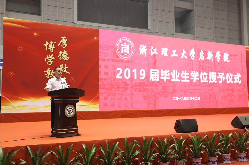 最后,启新学院、创业学院院长汪亚明致毕业辞。他对2019届毕业生在大学四年取得的优异成绩表示热烈的祝贺,并深情寄语毕业生要在树立远大理想中不断奋斗,在热爱伟大祖国中不断奋斗,在练就过硬本领中不断奋斗,在锤炼品德修养中不断奋斗,衷心祝愿毕业生们在未来的道路上,不懈奋斗,不断书写人生的精彩故事,成长为真正的国家栋梁!