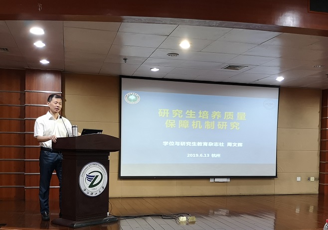 周文辉向与会人员作“研究生培养质量保障机制研究”专题报告。他从学位点评估、研究生教育的新常态着手,强调指出提高质量是我国当前研究生教育的中心工作。随即从“保障什么?谁来保障?怎么保障?”三个方面,向大家系统阐述了研究生培养质量保障机制问题。报告内容丰富,信息量大,涵盖研究生课程教学、学位论文、社会服务、招生、分流淘汰、研究生满意度、导师指导等方面,在提高我校导师对研究生教育教学政策措施的认识,提高研究生教育工作水平方面,具有较大启发和现实指导意义。