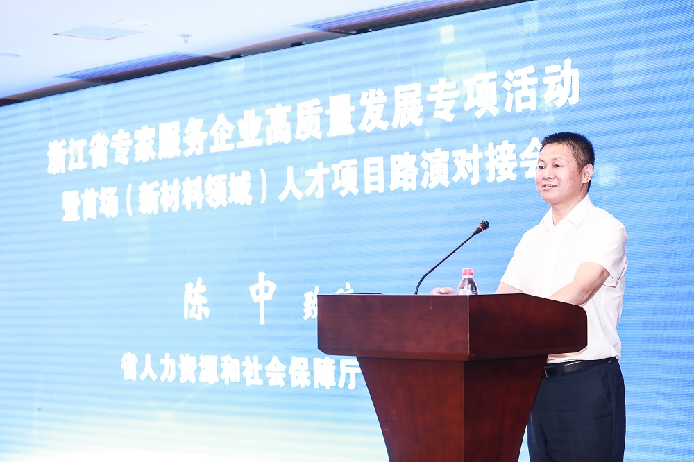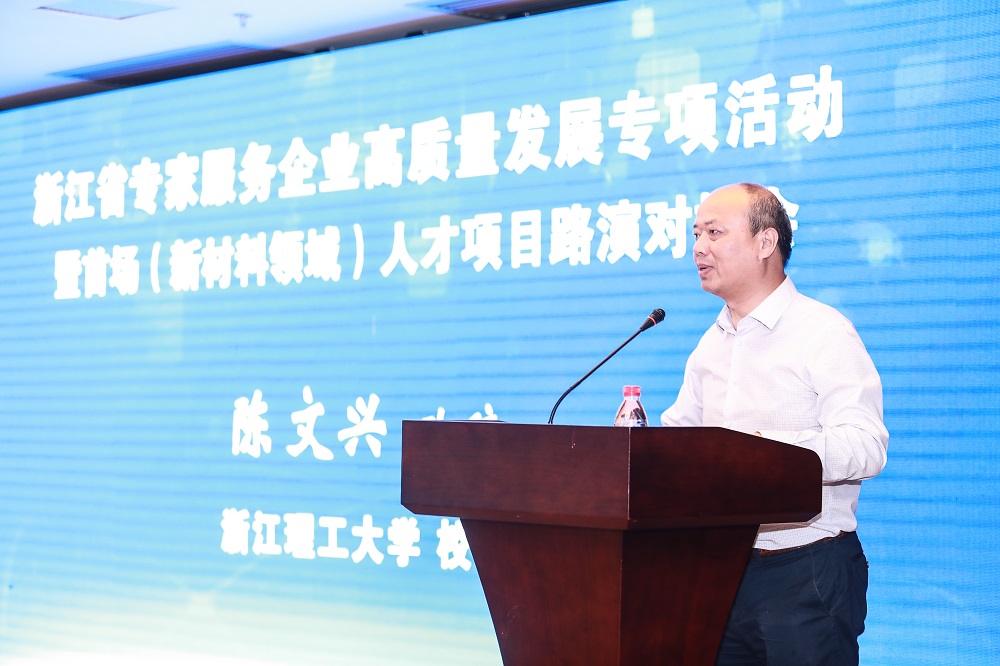 5月28日下午,浙江省专家服务企业高质量发展专项活动暨首场(新材料领域)人才项目路演对接会在省人才市场三楼路演厅举行。本次活动由省人力资源和社会保障厅和我校联合主办,由浙江省专家中心、浙江省人才市场和我校科研院、人事处承办。“拉高标杆 精准实施‘三服务’”是活动的主题,旨在聚焦新材料领域,帮助企业导入人才项目高端要素,助推企业高质量发展。省委人才办专职副主任张旭明、省人力资源和社会保障厅副厅长陈中,我校校长陈文兴,省专家中心、省人才市场、我校科研院、人事处及省内各市人力资源和社会保障部门负责人、有关企业负责人和专家200余人参加大会。会议由省专家中心主任陈华良主持。