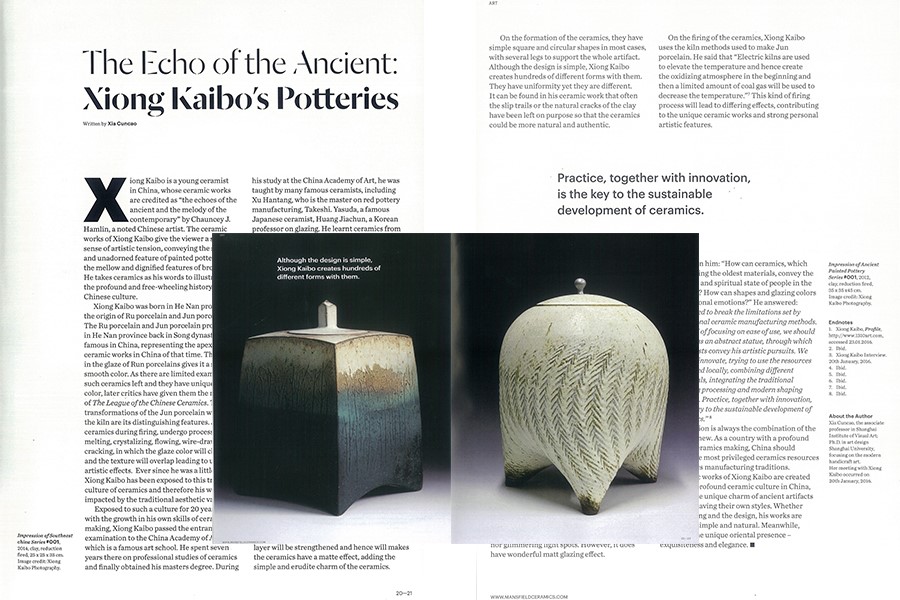 近日,我校艺术与设计学院熊开波副教授通过海选,成为代表中国唯一参加2019年国际陶瓷艺术双年展的艺术家。大量国际媒体开始关注和评论其作品。其中,A&HCI期刊《Ceramics:Art & Perception》(《陶瓷:艺术与感知》)第111期刊登评论《The Echo of the Ancient》(《远古的回响》)。文章用四个版面(其中两整版作品图片)重点介绍和评论了中国著名陶艺家熊开波的作品,从材料、形态、成型、釉色、烧制等几个方面展开论述,称其作品“让人感受到饱满而向上的艺术张力、质朴而内秀的彩陶神韵、厚重而端庄的青铜器气息”。文章用“远古的回响,现代的旋律”的评论肯定熊开波的陶瓷作品不但诉说着中国悠久的历史和厚重的传统文化,而且具有自己独特的陶瓷艺术语言和时代创新性。
