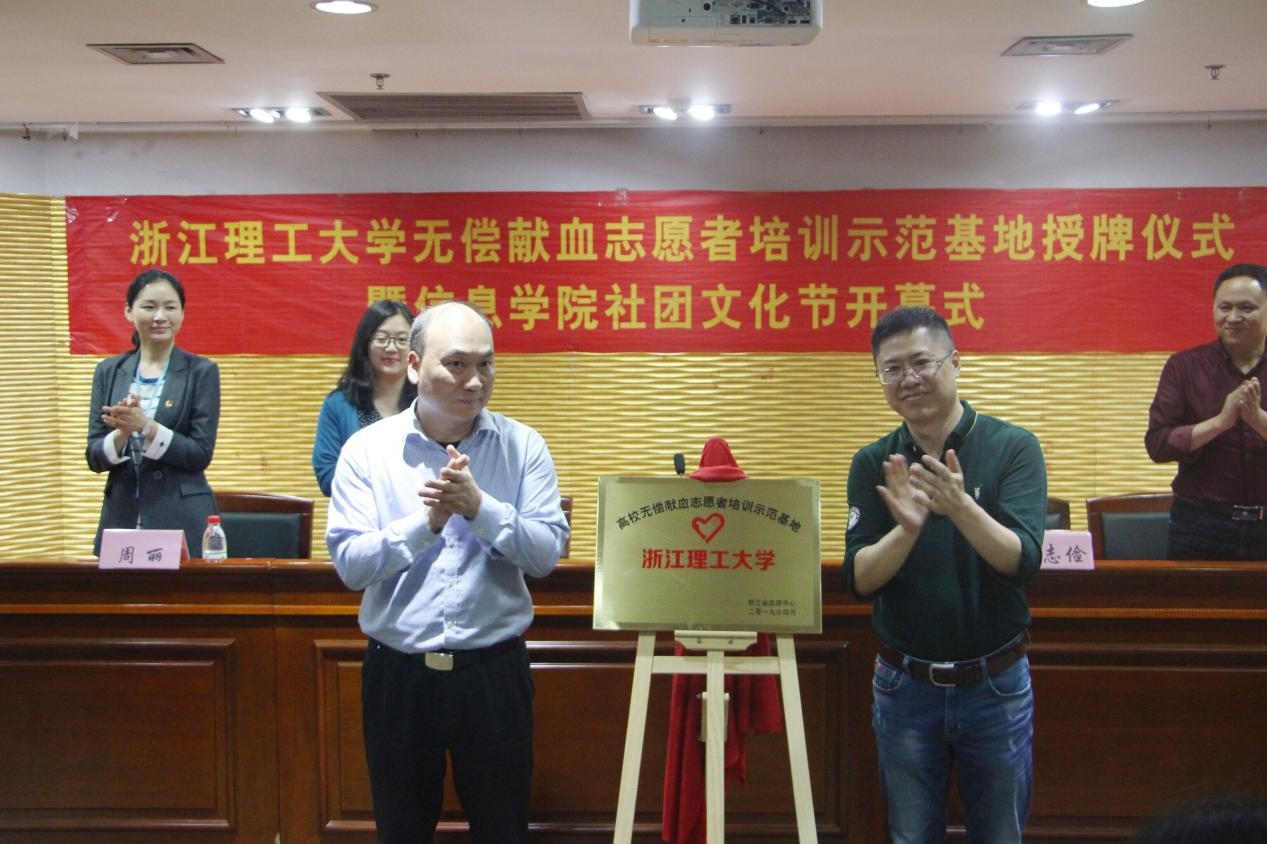 4月24日下午,tyc33455cc太阳集团成网官方入口无偿献血志愿者培训示范基地授牌仪式暨信息学院社团文化节开幕式在我校行政楼一楼报告厅举行。浙江省血液中心党委书记、副主任陆新成,浙江省血液中心社会事务科科长罗建根,浙江省血液中心团委书记周丽,信息学院党委书记苏志俭及校团委、校医院负责人等出席了本次会议,会议由信息学院团委书记尹小虎主持,会上进行了“tyc33455cc太阳集团成网官方入口无偿献血志愿者培训示范基地”的授牌仪式。