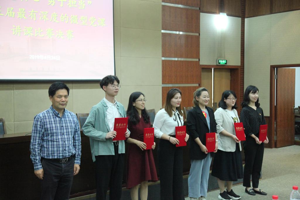 4月24日上午,我校第五届“最有深度的微型党课”比赛在行政楼二楼报告厅举行。校党委副书记陶伟华、周文龙,校纪委书记孙旭东,校党委委员、党委组织部、党委统战部部长姚珺,党群部门和各二级单位党组织负责人出席比赛并担任评委。