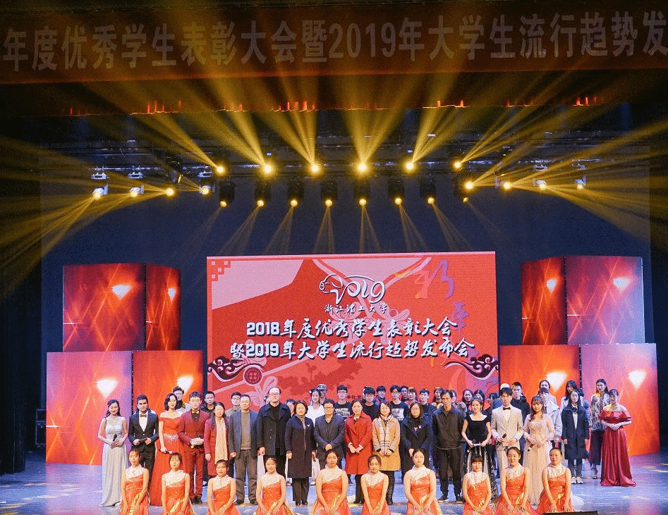 表彰大会后,举办了2019年大学生流行趋势发布会。晚会发布了从广大学生中征集的 “含容·允能·博仁·赓续 ”四个关键词,阐释了广大学生对2019年国家、社会及个人发展的深刻认知和热切期待。学生社区组织为全场师生带来了精彩的表演,手语舞《三生有信,语你相遇》、古风舞蹈《子衿》等演绎传达了同学们对美与善的的追求,由退伍学生带来的《练为战》以阳刚正气和保家卫国的铿锵呐喊展现了理工学子的家国情怀,社区宿管员阵容强大的T台表演以温馨和谐的画面秀出了“幸福浙理”的内在含义。