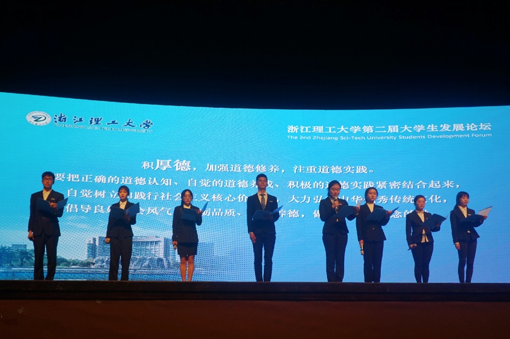 在大学生发展论坛交流环节,10位优秀校友、首届校长特别奖获奖代表、“十佳大学生”代表及浙理卓越人才基地学员代表以“青春选择奋斗 梦想绽放芳华”为主线,以“厚德、博学、开放、创新、共享、融合”为关键词,结合自身成长和学习经历,与全场师生共同探讨大学生发展问题,会场气氛热烈,掌声不断。论坛下半场启动了我校卓越人才基地海外集训营项目和卓越人才基地海外研修营项目。最后,卓越人才班全体学员共同向全校学生发起倡议:立足使命,践行校训,“厚德、博学”以容载万物、笃行不倦;“开放、创新”以适应社会、报效祖国;“共享、融合”以成于至善、砥砺前行,拓宽人生征程,碰撞智慧火花,不忘初心,勇于担当,用实际行动诠释理工精神。