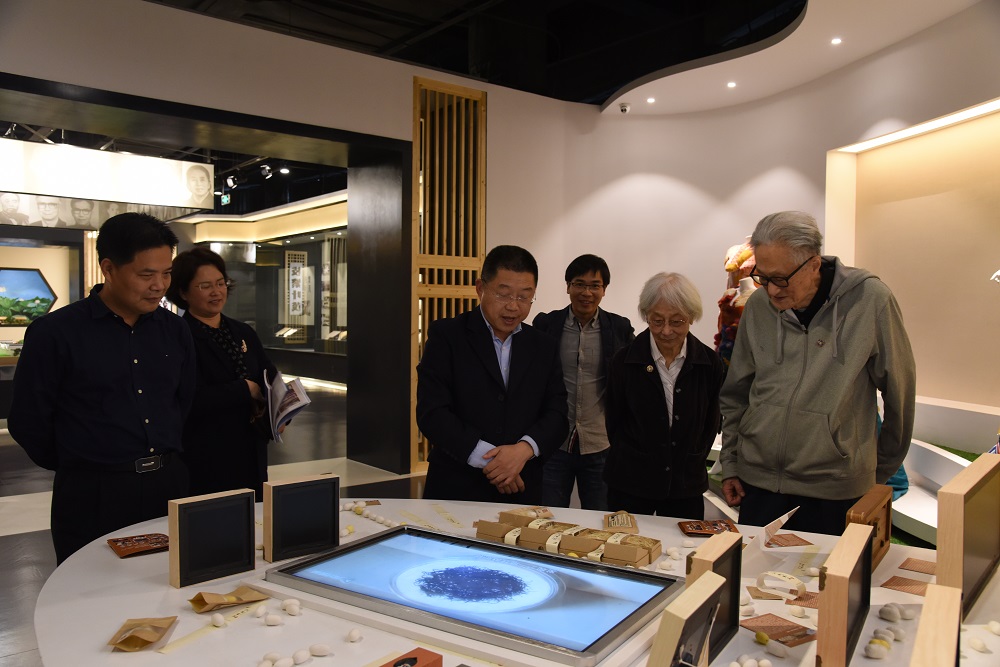 仪式后,周文龙一行陪同蒋世承、程涓参观了校丝绸博物馆。博物馆序厅里展陈有一张蒋氏家族拍摄于1934年的全家福。