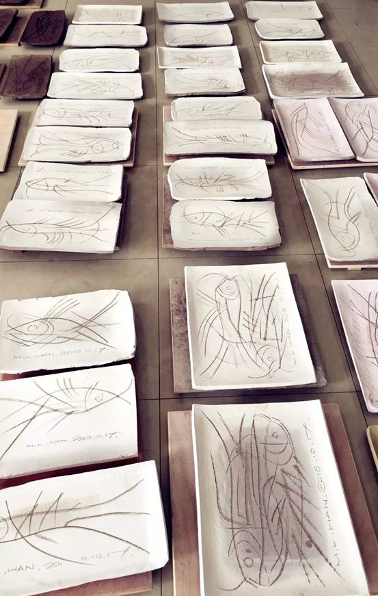 接下来,这些刻好的陶瓷盘将被喷上一层薄薄的釉,然后被放置在1200度以上高温的炉窑里进行烧制,这些生于泥土的陶坯刻盘“太空鱼”,将如同获得生命般自由自在地游到太空中去。
