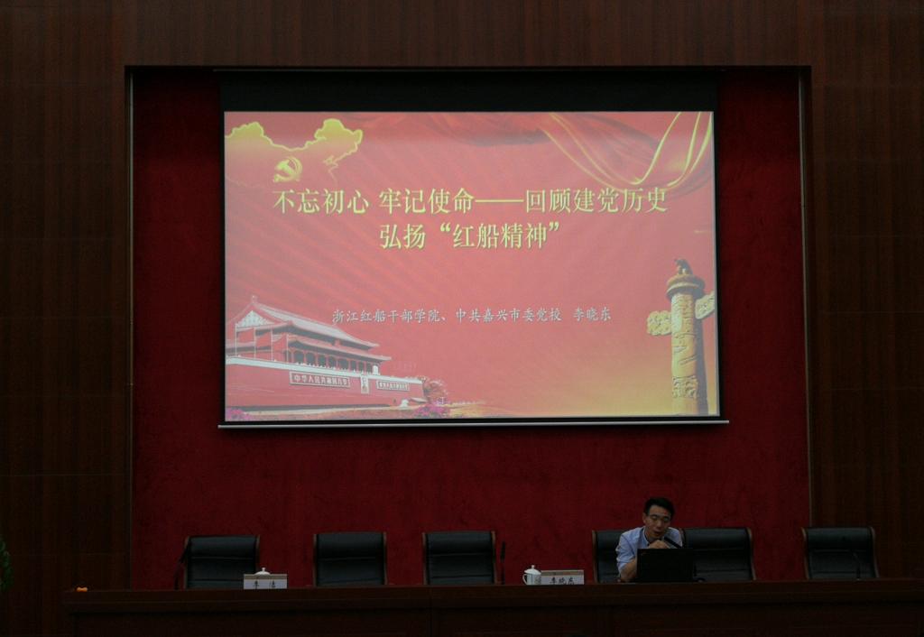 在现场教学环节,学员们前往嘉兴南湖革命纪念馆瞻仰革命圣地,追寻红色记忆,重温党的光辉历史,感受新时期红船精神。在周文龙的带领下,学员们面对党旗庄重的重温入党誓词。浙江红船干部学院副院长、嘉兴市委党校副校长翁为平等领导会见了培训班一行,回顾了红船干部学院与我校的合作渊源,并就深化合作共建提出展望。浙江红船干部学院干部教育学院院长李洁为学员介绍了红船干部学院的红色文化,李晓东博士为学员们作了题为《不忘初心牢记使命——回顾建党历史 弘扬红船精神》的专题报告,他从精神的力量、历史的足迹、时代的价值三个篇章深刻阐述了“红船精神”的内涵、“红船精神”的孕育过程以及如何传承好“红船精神”,建议学生思政干部应把弘扬“红船精神”同深化党的十九大精神学习宣传贯彻结合起来,牢牢把握习近平新时代中国特色社会主义思想这个主线,真正在学懂弄通做实上下功夫。