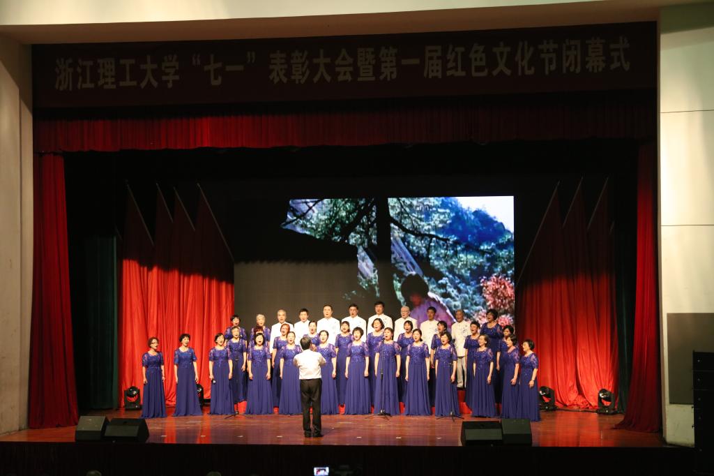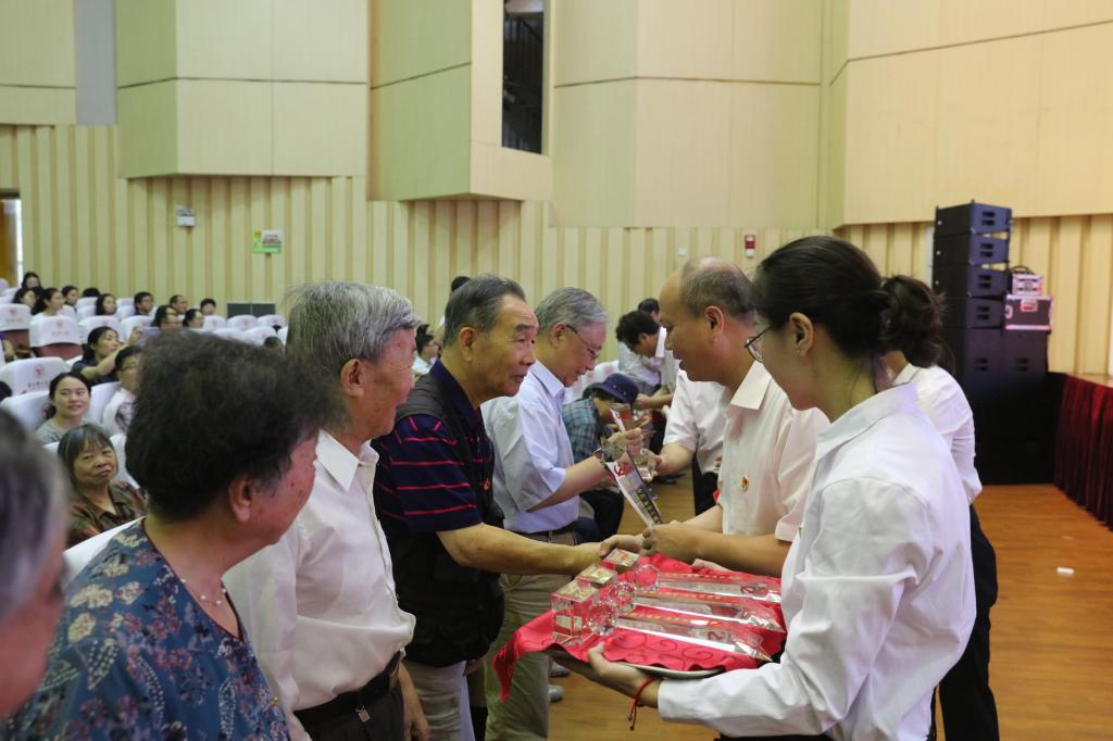 由离退休党总支教工“欢乐合唱团”带来的合唱表演《绒花》、《共筑中国梦》拉开了大会的序幕。31名党龄在50周年以上的老党员接过校领导颁发的纪念杯。