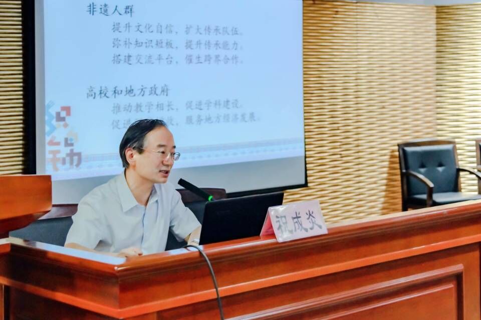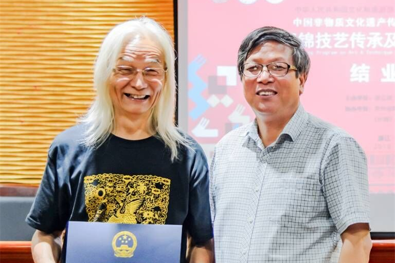 研修项目负责人祝成炎教授总结了本次研修班的工作开展情况。学校在往届非遗研修班的开展基础上,总结经验,围绕“巩固保护成果,提高传承水平”的指导思想,在“织锦技艺传承及创意设计研修班”的办学中,创造性地开展织锦技艺的保护和活态化传承工作。