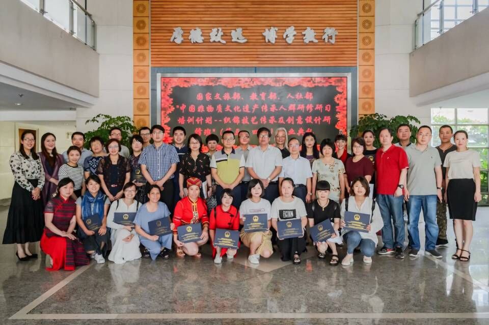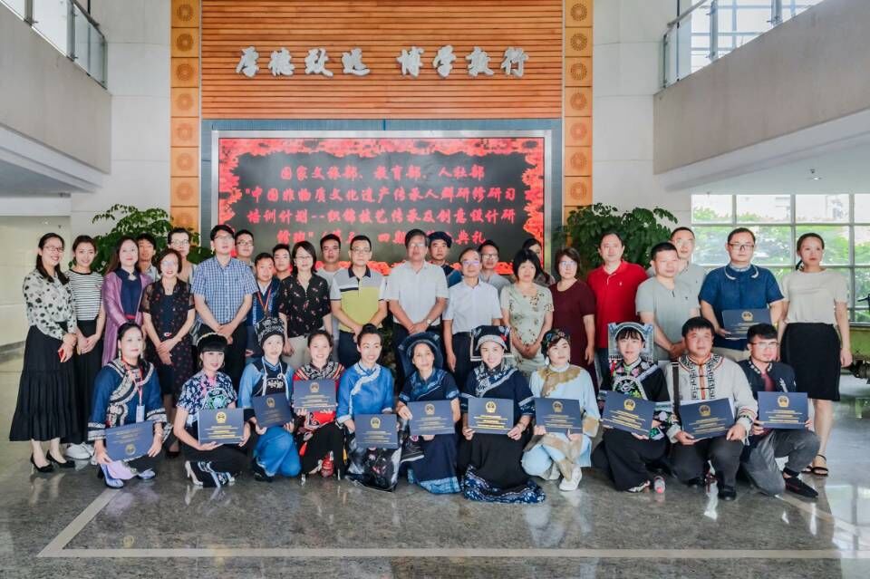 最后,41位传承人从校领导手中一一接过熠熠发光的结业证书,进行了合影留念。黔南州纺织特色非遗研修班的全体学员还为研修班创作合唱了一首布依族山歌,以表示对tyc33455cc太阳集团成网官方入口和黔南州文广新局的感谢之情。