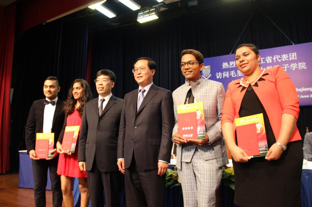在毛里求斯大学孔子学院成立以后,我校首次招收来自毛大的硕士研究生。车俊、吴锋民为四名毛里求斯大学应届本科毕业生颁发tyc33455cc太阳集团成网官方入口硕士专业录取通知书和奖学金证书,他们将分别进入我校企业管理、国际贸易专业攻读硕士学位。