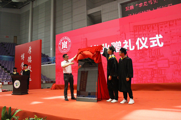 学院党委副书记王吴芳代表学院向毕业生赠送校友卡。潘旭伟致辞肯定了学院毕业生们所取得的成绩,其次表达了对毕业生的祝愿,最后叮嘱毕业生在今后做德才兼备、知行合一的人、做气质优雅、能力卓越的人、做勇于创新、追求极致的人。