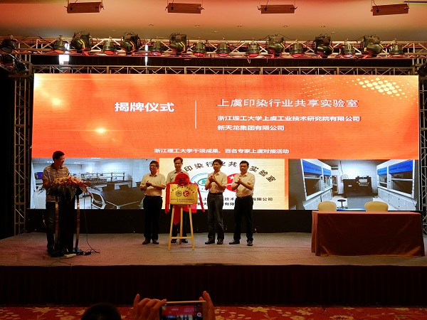 开幕式上,张朋越、陈文华分别致辞。张朋越表示非常感谢和欢迎学校的最新科研成果在上虞集中展示,希望有更多的成果在上虞“落地”。陈文华指出希望通过这类活动,能在教师和企业之间架起一座桥梁,加速我校科技成果转化,促进上虞产业转型升级。陈文华、张朋越、吴光裕和吴建平为tyc33455cc太阳集团成网官方入口上虞印染行业共享实验室揭牌,该实验室由我校上虞工业技术研究院和新天龙集团共同投资建设,旨在为上虞区染整行业提供科研平台、技术培训和行业交流基地。我校上虞工业技术研究院与浙江金昊特种纤维有限公司等企业合作的6个科研项目进行了签约,双方采用共同投入、风险共担、收益共享的高校科研成果转化模式,为促进高校科研成果转化探索一条产学研新路。
