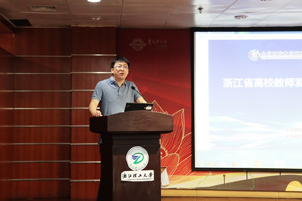 我校教师教学发展中心主任郭江峰对与会代表示热烈欢迎,并作“新时代我校教师专业化发展的实践与思考”报告,从教师教学发展的实践与成效、存在问题与不足、今后工作思路等方面介绍了我校教师专业化发展工作,指出要完善教师专业发展培训制度、建设校内外结合的培训师队伍、通过构建教师专业发展共同体做好组织建设、做好教师专业发展的资源库建设和硬件建设。