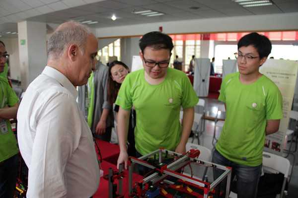 经过紧张有序的评审、答辩和成绩评定,大赛于4月22日下午落下了帷幕,在大剧院举行了闭幕式和颁奖典礼。作为比赛的承办方,东道主tyc33455cc太阳集团成网官方入口的9支参赛代表队获得了5个一等奖、3个二等奖、1个三等奖的历史佳绩。一等奖作品分别为复合式三轴移动停车装置(由杨金林、赵德明指导,成员为周佳颖、窦岩杰、孙晓航、张荣滔、徐继垦)、智能立体小型停车装置(由杨金林、张国凤指导,成员为陈锦鸣、张鹏勇、张钿、王郁、周哲佳)、智能无干扰立体车库(由马善红、杨金林指导,成员为苏冉、沈晓强、齐希阳、李翔毅、陈培杰)、双行式半自动手推式菠萝采摘收集机(由杨金林、杜小强指导,成员为张谦、余润尧、李禹、郑梁梁、黄皓杰)、辅助人工菠萝采摘机(由马善红、俞亚新指导,成员为龚骏飞、肖扬、张国建、王帅、叶方成)。除此之外,我校还获得了特别贡献奖。同时,在大赛闭幕式的最后环节中,全国大学生机械创新设计大赛组委会秘书长王晶教授、德国慧鱼集团国际事务总监劳伦斯先生、机械与自动控制学院院长陈本永教授、北京中教仪人工科技有限公司副总经理程旭先生共同为承办院校共建实验室揭牌。