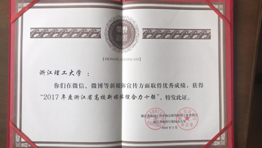 在近日召开的2018年全省教育宣传暨教育政务新媒体建设工作会议上,对教育系统及高校在教育宣传、新闻报道、新媒体建设等方面表现突出的单位进行了表彰。我校以全省排名第四的成绩荣获“2017年度浙江省高校新媒体综合力十强”。