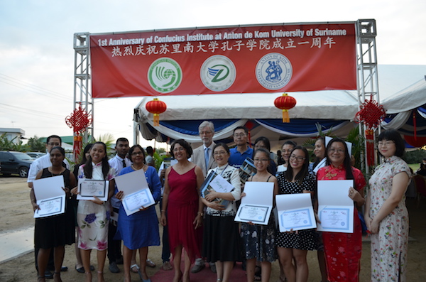 大使致辞后,是丰富多彩的文艺活动。由马自奋老师带领60位学员表演的太极拳吸引了来宾的注意力,尽管学员们的一招一式还不是很熟练,但从他们的认真和专注看出其对太极拳文化的认同,表演完毕,全场欢呼;刘哲老师组织学员演唱了几曲清丽、婉转、舒缓的《茉莉花》、《月亮代表我的心》等中文歌曲,给大家带来了美的享受;而苏里南文化艺术中心演员们带来的扇子舞,动作优美、身姿曼妙,极富中国韵味。活动最后,孔院领导与教师向刚刚结业的二期学生一一颁发证书并与其合影,手捧这用勤奋与智慧换取的证书,学员们感概万分,纷纷表示要努力学习,再创佳绩。