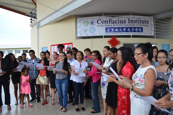 苏里南大学孔子学院由我校和苏里南大学共同建立,首期注册学员共有89人,分为四个班级,自去年5月15日开课以来,教师全力投入、学员积极配合,课程教学成绩喜人。在首期学员的影响下,二期招生报名火爆,因师资短缺,名额控制在100人,分四个班,并于去年10月28日开课。孔院学生除少部分在校学生、退休人员外,大部分是在职人员,他们来自各行各业,有教师、医生、律师、狱警、交通警、消防员、银行职员,还有海关、内政、农牧、工商、外交等部门的官员,甚至有国会议员、中资企业的职工等,为他们组织好课堂教学,意味着有朝一日能把我们的华夏文化传播到苏里南每个部门、每个角落。为此,任课教师全力以赴,课堂内传授基本汉语知识、课堂外组织与参与各种文化活动。通过努力,孔院学员已在语言学习、文化体验中迈出了稳健的一步。