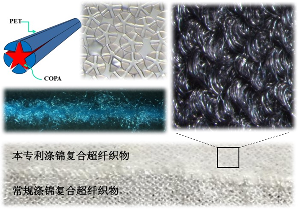 专利“一种超细型复合纤维及其加工工艺”通过聚合物原料和纤维截面的独特设计,经一步法熔融纺丝可直接制备具有优良异收缩性能的裂离型复合纤维,避免了同类超细纤维需与高收缩纤维网络合股的工序,其织物无需磨毛即获得优异的绒感。与常规同类纤维相比,该纤维具有潜在异收缩性强、热收缩可控的性能优势。该成果以材料学院新型纤维材料实验室王秀华教授为第一发明人,多年来该团队围绕新型纤维的设计与制备,与化纤产业深度融合,专注于解决差别化、功能性纤维开发过程中的痛点难题。
