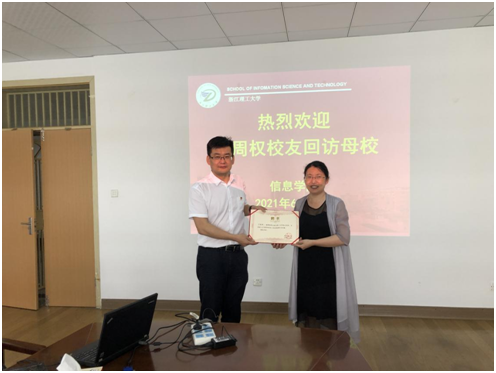 党课开始前,学院党委书记黄黎、党委副书记包新春在10-315会议室与丁周权校友一起座谈,并聘请校友为我校校友导师。