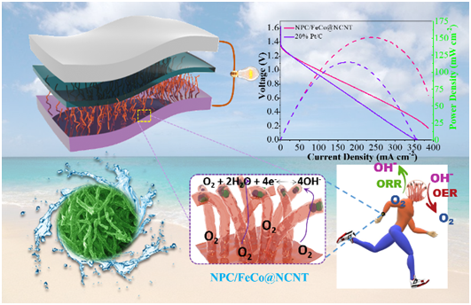 本研究设计了一种新颖的方法,主要以氧化石墨烯为碳源,首先合成了FeCo合金纳米颗粒嵌入型氮掺杂碳纳米管(FeCo@NCNT),进一步在氮掺杂碳纳米管上包覆氮磷共掺杂碳层,得到NPC/FeCo@NCNT复合材料。该催化剂在OER和ORR方面均表现出理想的电催化活性,当电流密度为10 mA cm-2时,OER过电位为339.5 mV,ORR起始电位为0.92 V。研究发现随着结构的演变,双功能催化性能逐步提升。同样,该催化剂在液体和固态及柔性固态锌-空气电池中具有很好的实际应用价值。