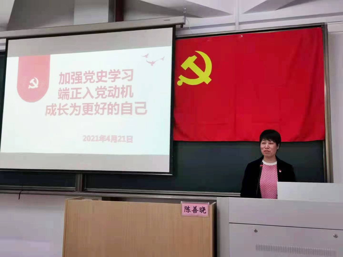 陈善晓以《加强党史学习,端正入党动机,成长为更好的自己》为主题为学员讲授了第一堂党课。她从“党史学习教育的重大意义”、“中国共产党的光辉历程”、“从红色服饰特展看党史学习”、“端正入党动机,争取早日入党”、“脚踏实地,做最好的自己”五个主题切入,鼓励学员们不忘初心、牢记使命,不仅要行动上入党,还用从思想上入党;要认真学习、努力思考,早日成为合格的共产党员,积极热情地投身于祖国的社会主义现代化建设事业中。