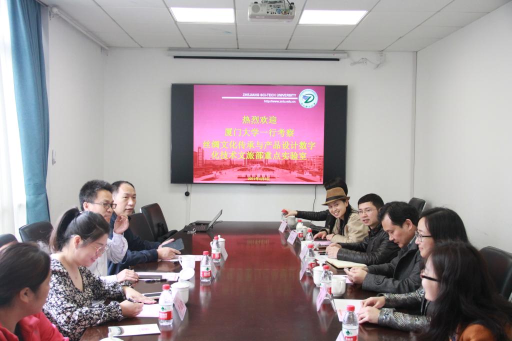 4月2日上午,厦门大学信息学院副院长姚俊峰教授、人工智能系主任史晓东教授以及科技处严文琦老师来访我校丝绸文化传承与产品设计数字化技术文旅部重点实验室,就文旅部重点实验室组织机制、人才培养、学科发展、学校支撑保障等方面进行了调研。在服装学院副院长须秋洁、文旅部重点实验室主任邹奉元、副主任吕昉及骨干成员的陪同下,姚俊峰一行参观走访了我校丝绸博物馆和文旅部重点实验室。参观结束后双方举行了座谈会,我校科技处副处长朱恩泽出席了本次座谈交流。