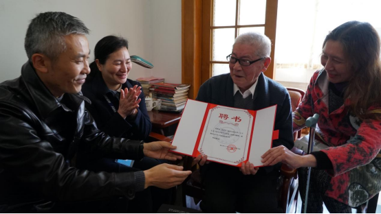 3月25日,我校艺术与设计学院党委副书记贾立壮、学工办主任陈璐带领师生队伍来到杭州市朝晖街道老房地社区,看望百岁校友袁启仁同志,并与社区对接合作事宜。