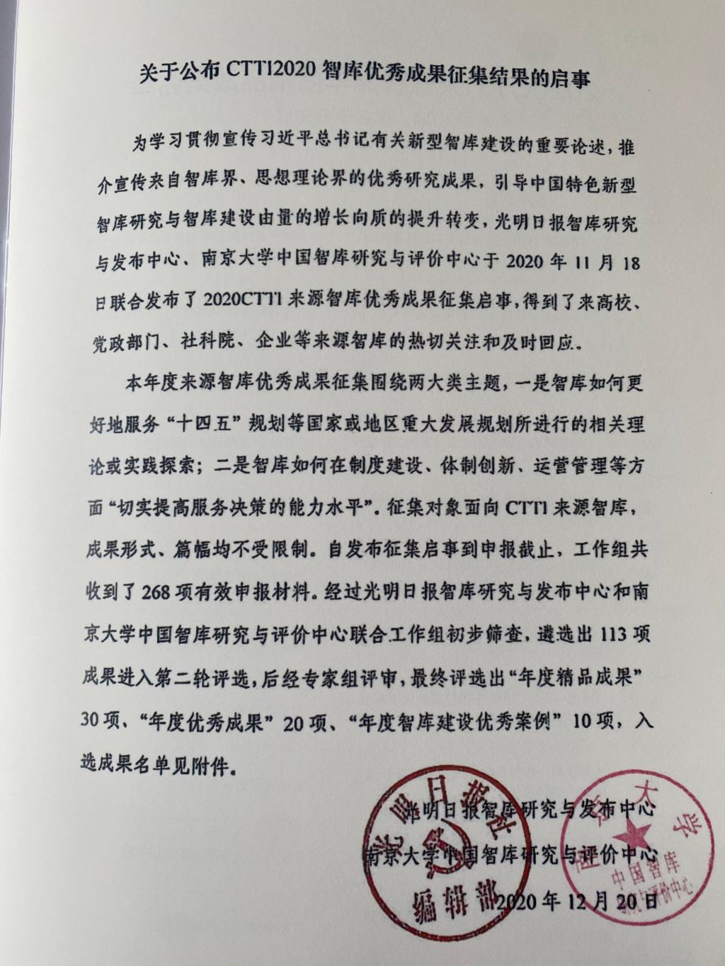 CTTI(中国智库索引)是由南京大学中国智库研究与评价中心、光明日报智库研究与发布中心联合研创,是我国权威的智库评价平台。CTTI每年会聚焦重大理论和现实问题举行年度优秀成果评选活动。