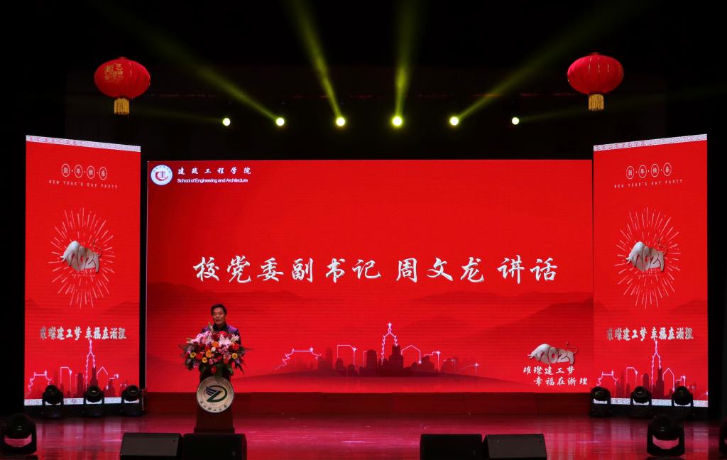 周文龙对本次活动的隆重举行表示祝贺。他指出,2020年是“十三五”收官之年,也是建筑工程学院满载收获之年,建筑学一级学科硕士点通过省学位办审核,实现了学院三个一级学科硕士点的全覆盖;建环、土木两个专业一次性顺利通过住建部高等教育专业(评估)认证,学校对学院2020年所取得的成绩是充分肯定的。他希望,2021年,建工学院党政班子继续在高质量发展的航道上,靠前指挥,带领和凝聚广大师生,肩负起“为党育人、为国育才”的光荣使命,发扬勇于担当、艰苦奋斗的精神,贯彻新发展理念,乘风破浪、行稳致远,以优异的成绩迎接中国共产党成立100周年。