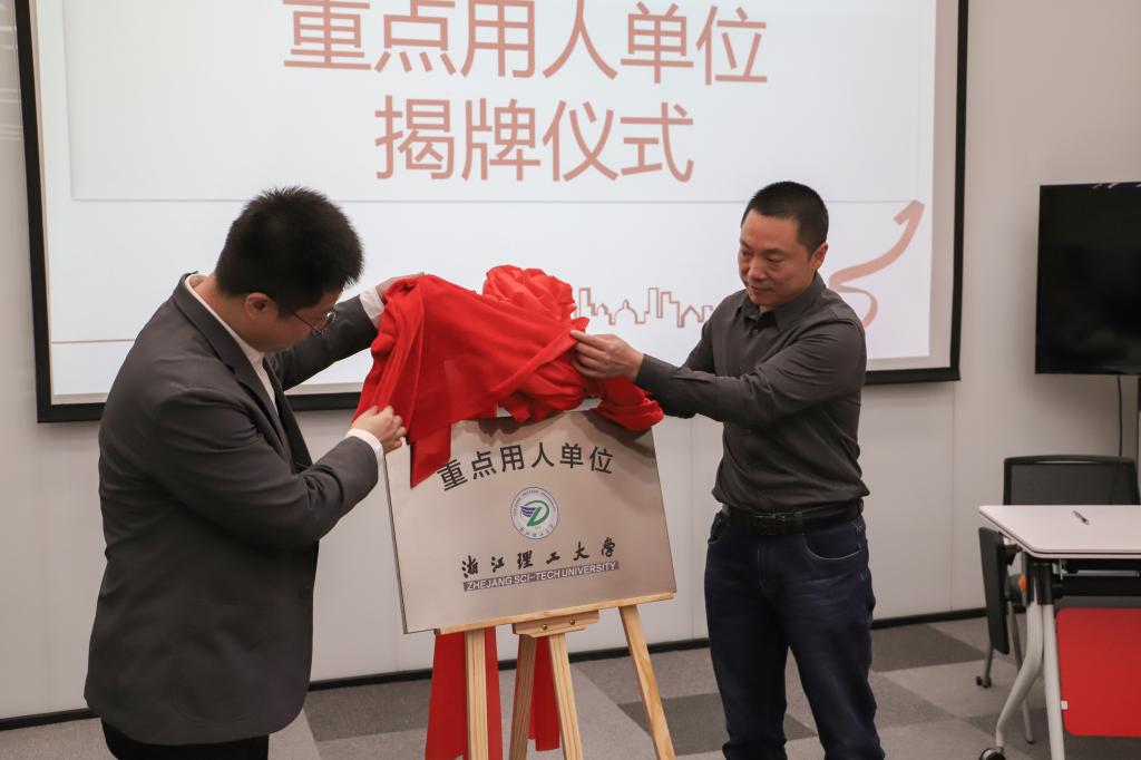 徐慧霞和俞峰共同为校企双方签订了实习协议,陈童和李孝明、刘朋和刘勇分别进行了重点用人单位和教学实习实践基地的揭牌仪式。