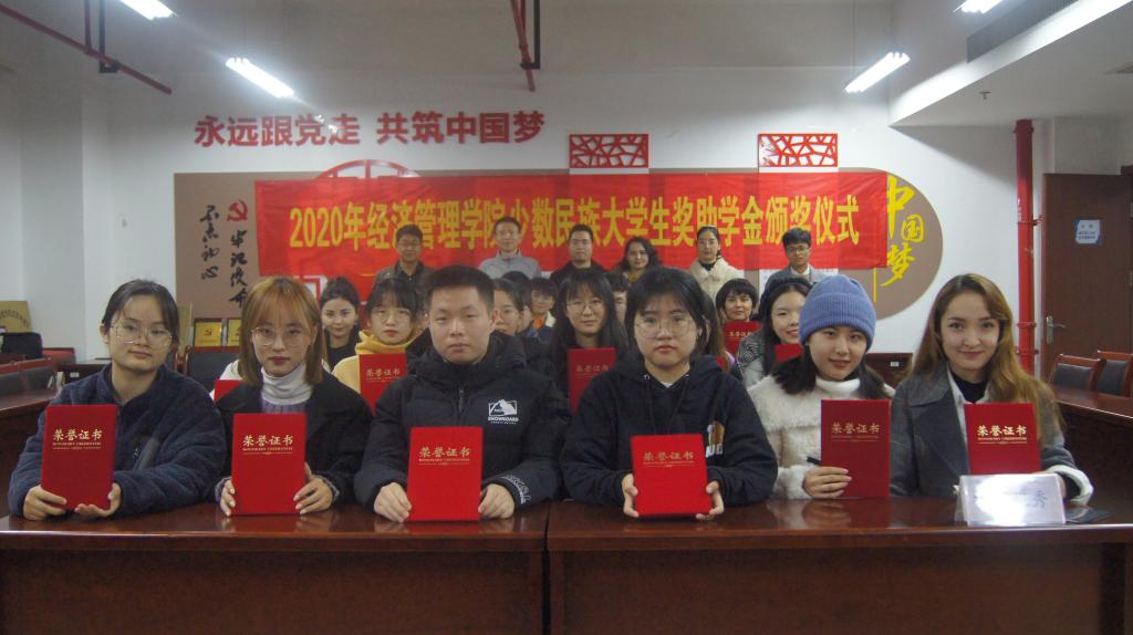11月25日下午,tyc33455cc太阳集团成网官方入口经济管理学院少数民族奖助学金颁奖仪式在25号楼1610会议室举行。学院党委副书记黄新海、校友兰景满和方涛、党委学工部少数民族辅导员古丽以及辅导员齐佳婷、徐文炜出席了颁奖仪式,参加本次会议的还有受奖助的少数民族学生。颁奖仪式由黄新海主持。