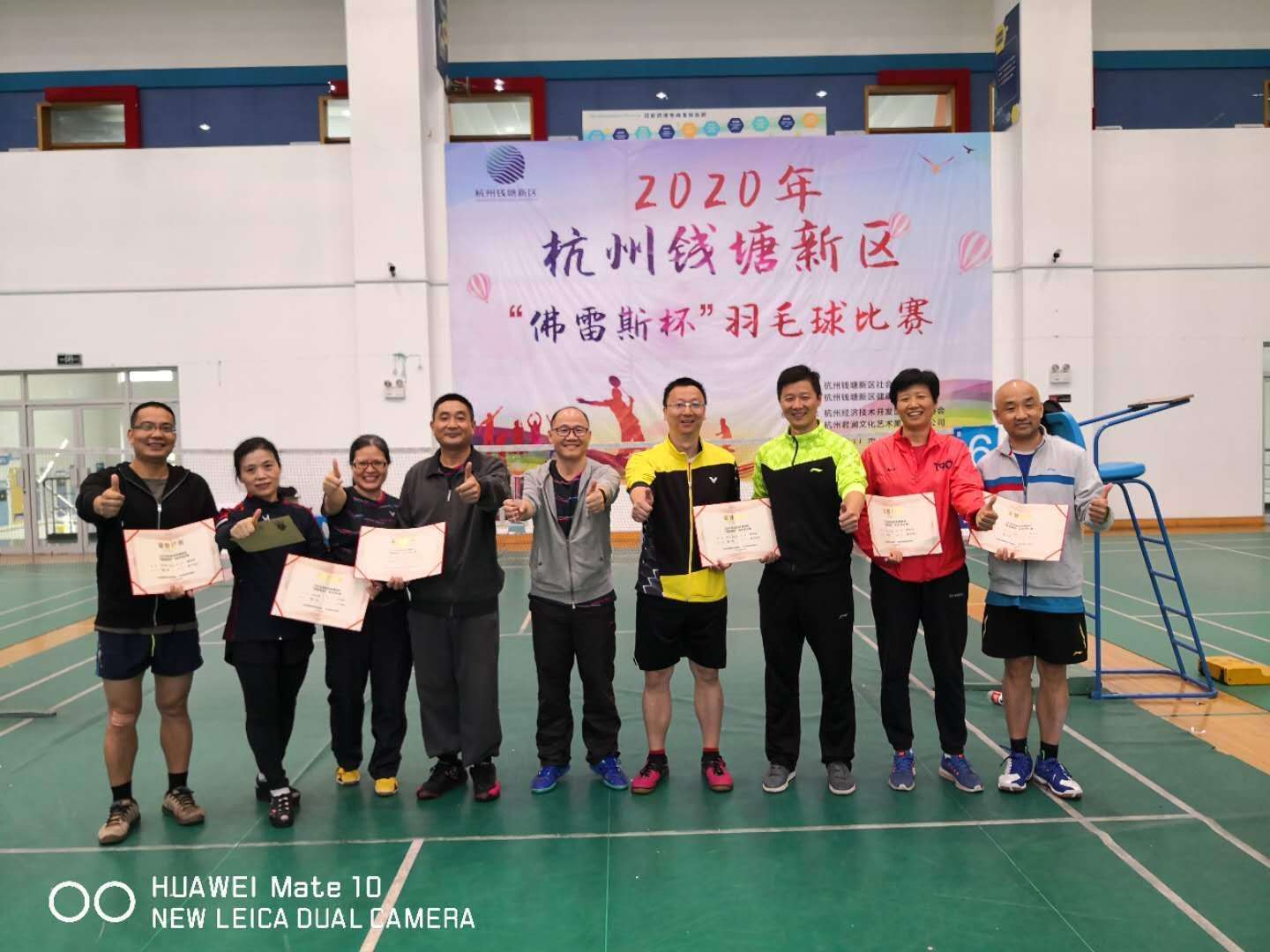 校园经纬 首页 > 校园经纬 > 正文 我校教职工在2020年杭州钱塘新区“佛雷斯杯”羽毛球比赛中取得佳绩 作者:校工会日期:2020-10-28浏览: 10月24日,为期两周的2020年杭州钱塘新区“佛雷斯杯”羽毛球比赛在浙江金融职业学院落下帷幕。在校工会的悉心指导下,我校教职工羽毛球协会积极组织参与,提供周到服务,科学排兵布阵,全体参赛教职工凝心聚力,迎难而上,敢打敢拼,勇夺钱塘新区羽毛球比赛机关组的混合团体季军。此外在单项赛事中,我校教职工收获青年组男双冠军、第六名,中年组女单第二名,中年组混双第四名的好成绩。