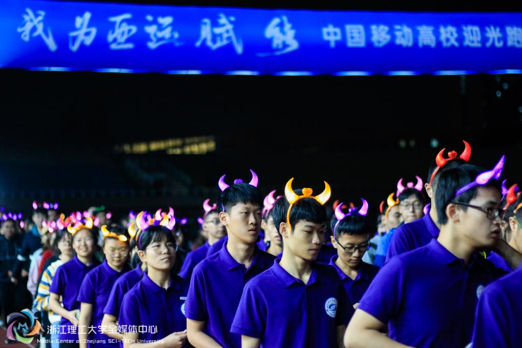 随后,经过简单的热身运动,同学们在旗手带领下,以学院为单位组成方阵,由西侧跑道出发正式开跑。他们头戴牛角灯,手戴荧光镯,按“s”龙型奋力奔跑,大家兴致高昂、活力四射,所到之处皆是一片荧光的海洋。
