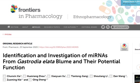 近期,我校生命科学与医药学院盛清教授课题组在中药miRNA研究领域取得新进展,经过五年多的不懈努力,对传统中药天麻miRNA的研究取得突破性成果,在《Frontiers in Pharmacology》(JCR二区,IF=4.225)杂志上在线发表题为《Identification and Investigation of miRNAs FromGastrodia elataBlume and Their Potential Function》的研究论文。