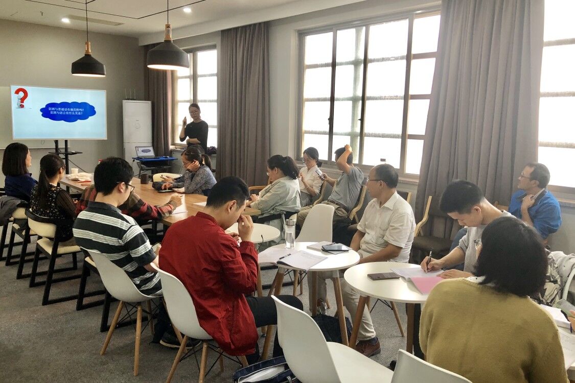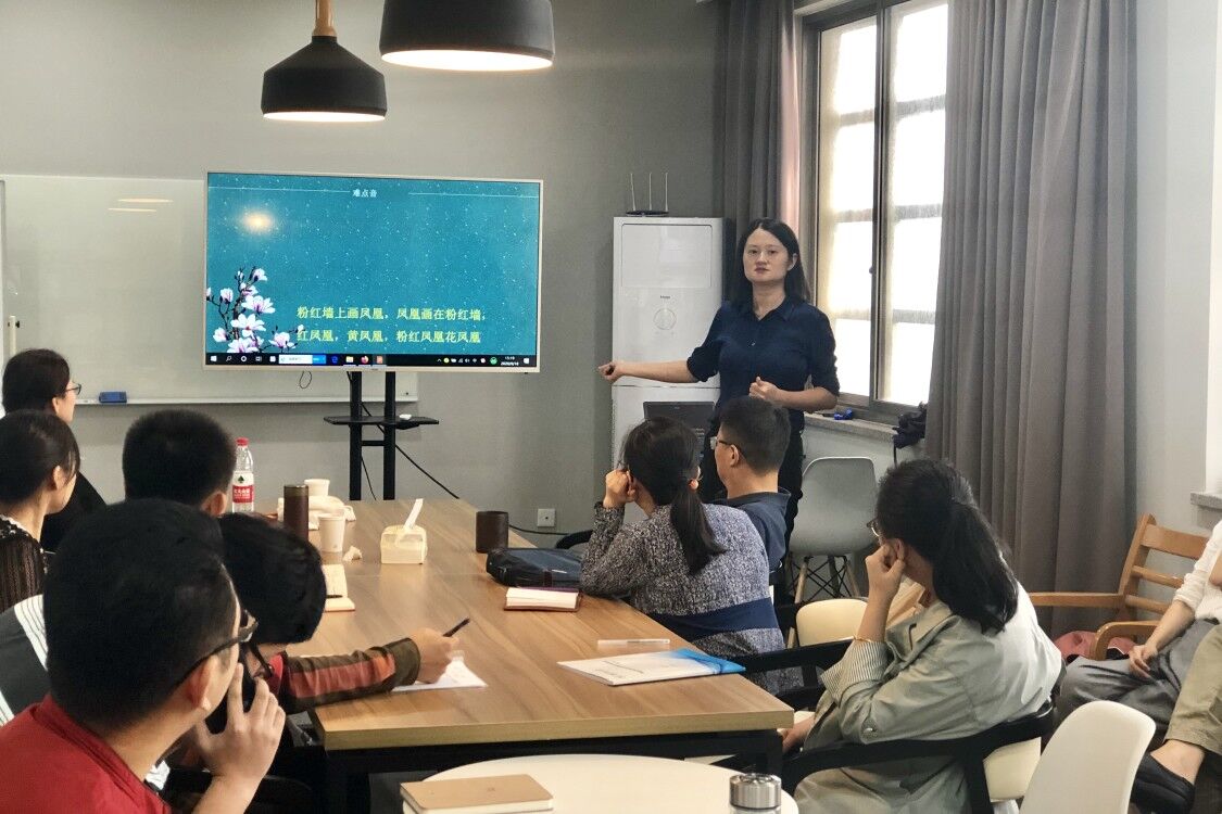蒋晓娜重点介绍了普通话发音中平翘舌音、前后鼻音等“难点音”,并与在场教师分享了此类重难点音的发音要领。此外,蒋晓娜提到,普通话的练习要掌握正确的方法,首先是了解自己的发音缺陷,克服方言影响,在学好拼音字母的基础上多听、多练,掌握发音部位,日常中通过收听新闻联播,读绕口令等也能很好的纠正错误发音,练就一口标准流利的普通话。