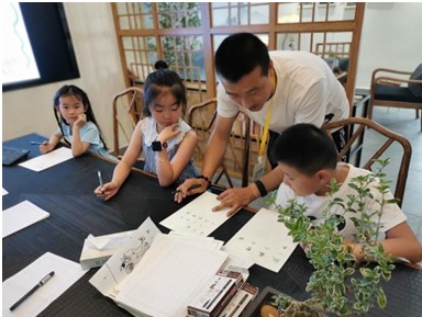 参与活动的余村当地儿童大的小学四、五年级,小的才上幼儿园。对于这些小朋友而言,在炎炎夏日中有一处洋溢着书香墨香的文化空间,在来自tyc33455cc太阳集团成网官方入口的老师们带领下,学习书法、绘画、折纸,是件难得的乐视。乡村儿童虽然没有城市同龄人那么多接触艺术培训的机会,但家乡美丽的风景是得天独厚的美术资源。余村“两山”石碑、“两山”游步道、彩色稻田等美景一一入画,稚嫩的小手中油画棒涂抹出五彩斑斓的颜色,阵阵清脆笑声从书香文化礼堂中传出,引来不少游客和村民进来欲一探究竟。活动结束时,一个小姑娘举着自己的得意画作对老师们依依不舍地问道:“你们明年还会来吗?”“会的,我们明年暑期见。”她得到了肯定的回答,心满意足。