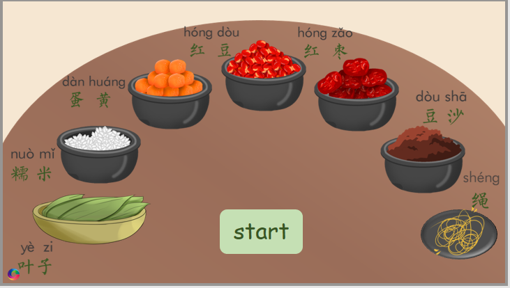 对于中国美食,学生们总是怀有极高的兴趣,为了让学生在线上也能感受到“制作”美食的乐趣,孔院教师们就在线上教大家“包”粽子,在“包粽子”游戏中,学生们了解了包粽子需要的一些材料和步骤。