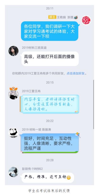 来自19级机控能动专业的李同学在经历了“云端”中国近现代史纲要的考试之后说道:“我觉得很神奇,小时候期待着在家就能上课考试的日子,如今就在眼前实现了”。我认为“云端”考试给我们带来了许多的便利,我们可以不用紧张的面对试卷,可以在寝室、家里进行考试,而不是去教室。对于老师来说,学习通的各种技术,例如采人脸信息比对、前后双摄监考、答题过程中监控切屏等等,让老师能够很方便的监控考生们的状态,保证整个考试过程公平公开公正。而从题库随机选取这一安排,杜绝了几位同学互相探讨的作弊问题,也保证整个试卷的难度与质量,希望在以后的考试中也多多结合现代科技技术,推行“云端考试”。