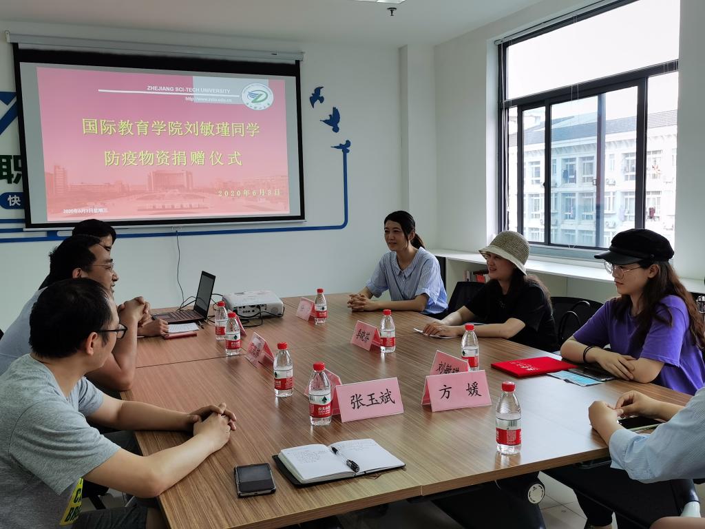捐赠仪式于6月3日下午在后勤综合大楼W512会议室举行,国教学院党总支书记、院长季晓芬、副书记任宁,后勤服务中心党总支书记黄兆林、副主任唐智国,以及捐赠人刘敏瑾同学出席了捐赠仪式。
